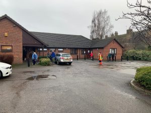 Our “very appropriate clothing” proved ideal for the conditions with Alan counting 8 layers at one point, and hi-vis waterproof over trousers proving their worth too! The team quickly established a one way pedestrian and queuing system, with space for social distancing and arrangements for managing traffic with limited car parking, the logistics and radio communications experience of BC4X4R proved invaluable. A good multi organisation group of volunteers worked well all day so that by 630pm around 500 vaccinations had been given to a range of elderly, vulnerable people and also a good number of NHS staff needing this crucial protection.