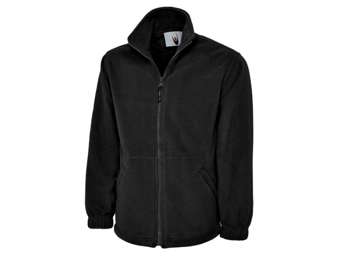 100% polyester. 300gsm Toasty and comfy, our classic full zip fleeces are popular year after year; great for embroidered logos, the anti pill material ensures no unsightly bobbles will appear after washing, while the elasticated cuffs and pull cords will keep the chill off of your arms and back. Everything is kept secure in the zip pockets and the cadet style collar is smart in more ways than one – stylisticaly and for keeping you extra warm! Other features include: twin needle stitching, full self coloured zip and hanger loop inside neck.